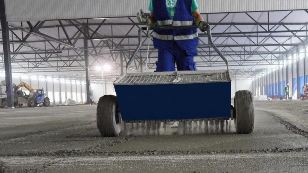 ▪ Нанесите упрочнитель (топпинг) DUROCOR или DUROQUARTZ, предпочтительно при помощи дозаторной тележки, чтобы создать равномерный слой. В первую очередь нанесите смесь на участки вблизи стен, колонн, дверных проемов конструкций, так как эти участки первыми теряют влагу. Расход топпинга при первом внесении - около 2/3 от общего объема.